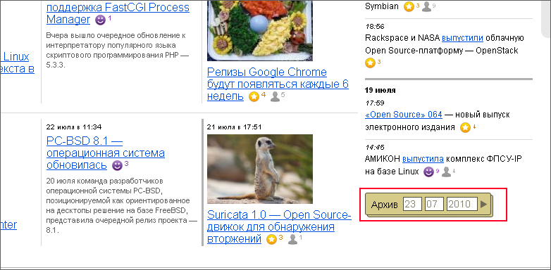 Сайт содержит большое количество новостей, которые являются достаточно регулярно обновляемыми. Соответственно существует некоторая форма хранилища для устаревающих новостей - Архив. С помощью данного архива должна быть возможность просмотреть новости за определенные промежутки времени.